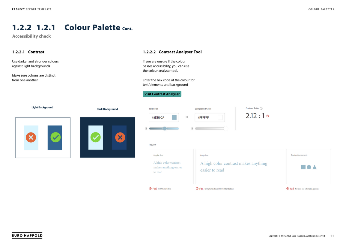 I developed a report system that combined visual identity, template design and workflow automation into a single solution. This included building a flexible design language for long-form documents, creating a large icon suite, and establishing template structures across both Microsoft and Adobe environments so the system could function coherently across the full process.