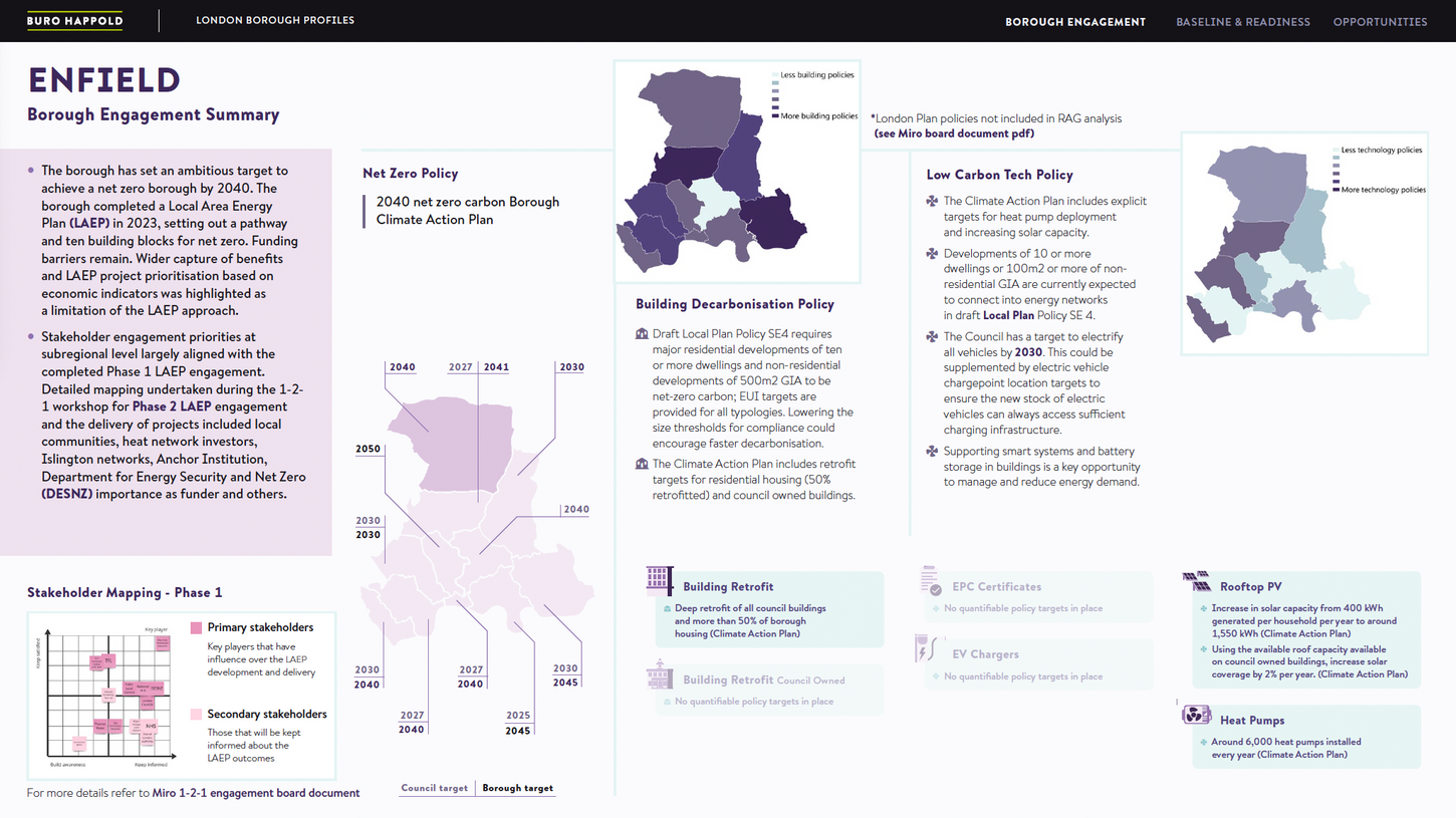 The result was a more scalable and coherent communication system for borough-level sustainability planning. By combining workshops, structured information design and automation, the project improved consistency, reduced manual effort and created a stronger framework for analysing technology options and supporting implementation strategy across London.