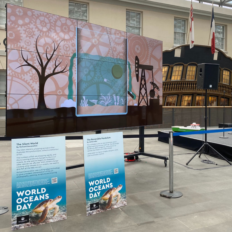 Created for the National Maritime Museum, Greenwich, this project was a visual response to World Oceans Day titled Revitalisation: Collective Action for the Ocean. At its centre was The Reversible Pendulum, an animation exploring the destructive impact of human activity on the ocean, while also expressing the planet’s capacity for healing and recovery.